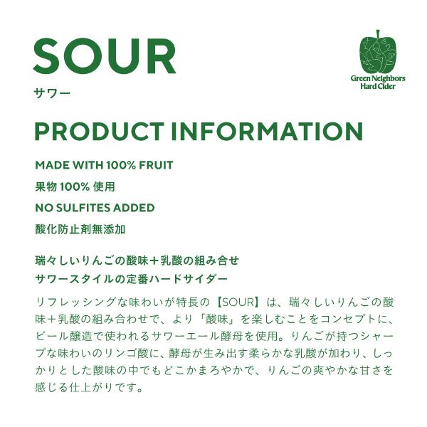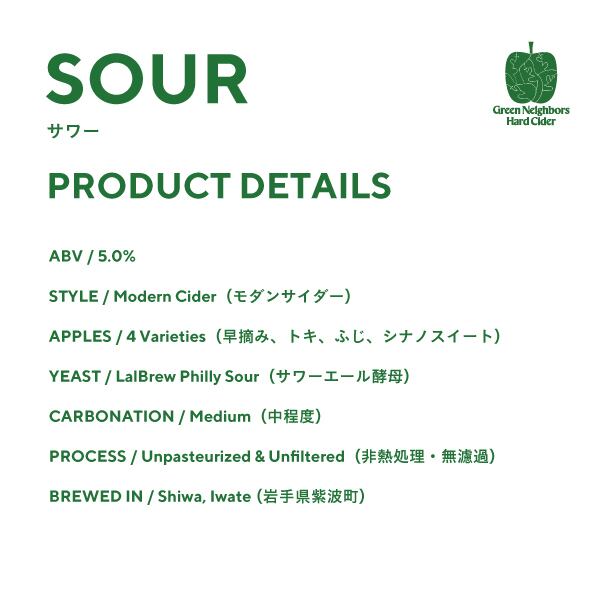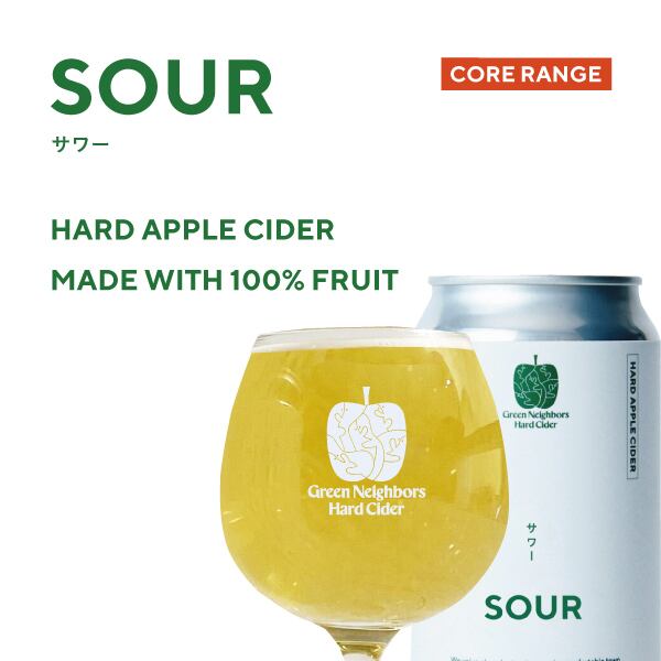 リフレッシングな味わいが特徴の【SOUR】は、瑞々しいりんごの酸味+乳酸の組み合わせで、より「酸味」を楽しむことをコンセプトに、ビール醸造で使われるサワーエール酵母を使用。りんごが持つシャープな味わいのリンゴ酸に、酵母が生み出す柔らかな乳酸が加わり、しっかりとした酸味の中でもどこかまろやかで、りんごの爽やかな甘さを感じる仕上がりです。